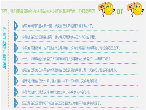培訓從一場有趣的時間管理測試展開,通過有趣的問答讓大家快速進入情境,加深對培訓必要性的認知。時間和才華是我們一生擁有的兩大財富,但若是隨著時間的流逝,我們的才華并沒有增加,這就是虛度了時光。只有我們妥善安排并利用好時間,通過實現人生旅途中一個個小目標,才能最終實現自己的人生大目標,實現規劃中的理想生活。