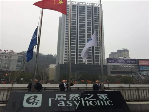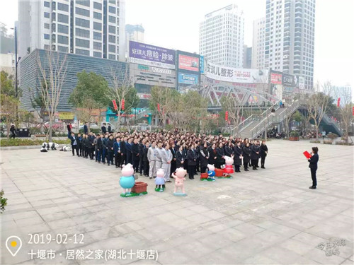 居然之家十堰店全體員工、商戶及銷售顧問聚集在六號廳門外,舉行新年升國旗儀式,以飽滿的熱情喜迎“2019年,開門紅”。