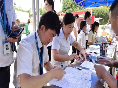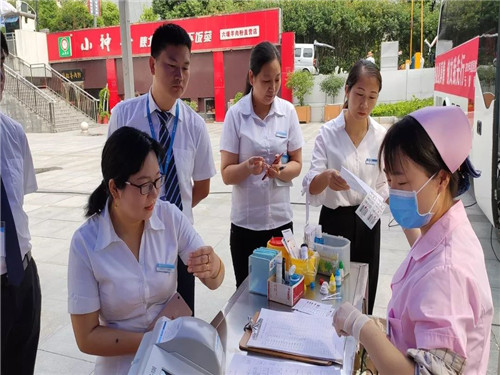 前來獻血的居然家人們在志愿者的引導下,有序領表登記,測定血型,量血壓,等待獻血。